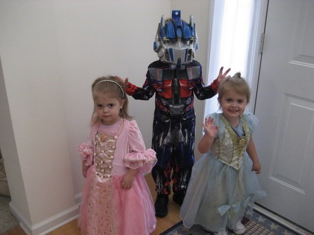 Halloween 2007 was just kind of blah. The best part was that the kids were very excited about their costumes. Xander was Optimus Prime (leader of the Autobots), Grace was Princess Aurora (Sleeping Beauty), and Greta was Cinderella. We had a flower and strawberry costume from Grace and Greta's first Halloween and the kids unanimously decided Marie would be "baby Strawberry Shortcake." I would have picked the flower one.