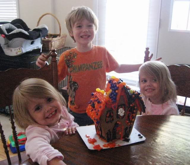 Here's some costume pictures. Don't ask where our pumpkin pictures are- we completely forgot to get one, but we did make a fun spooky cookie house!